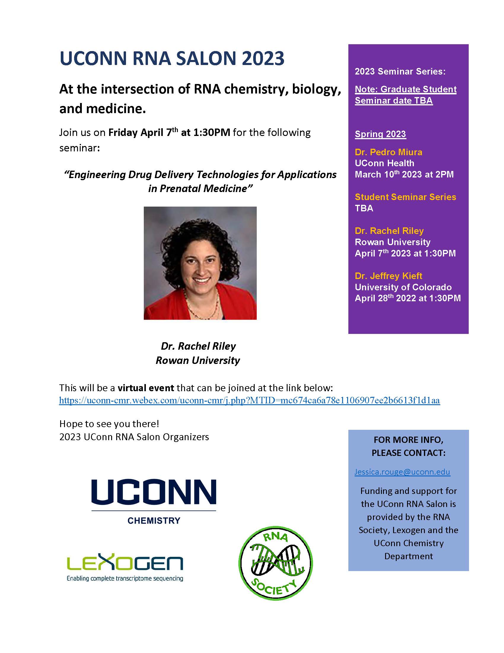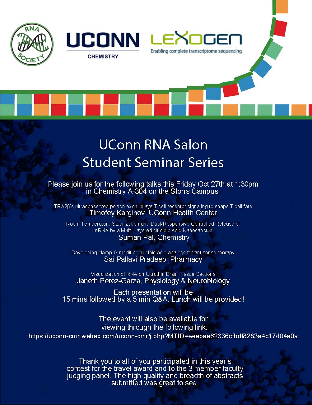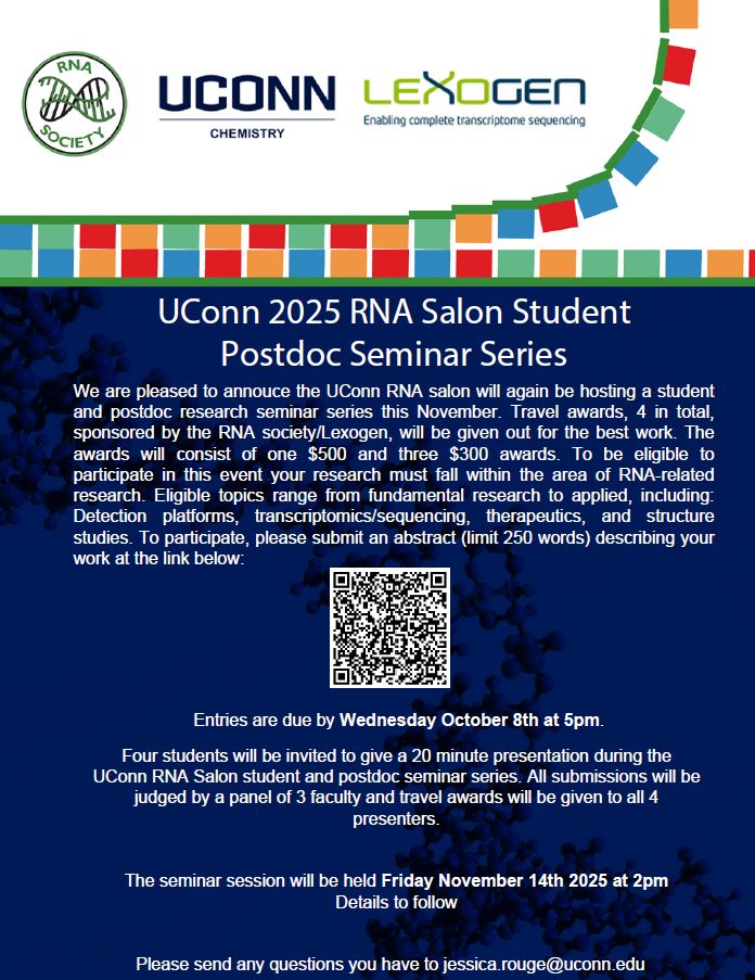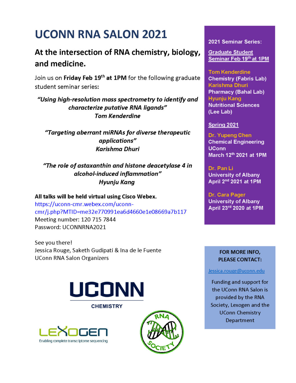 UConn RNA Salon – established in 2017 through funding by the RNA Society and supplemental funding from Lexogen, the RNA Salon is co-organized by members of the Rouge Lab and student co-organizers in other labs focused on RNA research on UConn campus. The UConn RNA Salon is intended for research scientists at all levels, ranging from undergraduate to graduate students, postdocs and faculty, with interdisciplinary backgrounds, bringing attendees from chemistry, molecular cell biology, chemical engineering, biomedical engineering, pharmaceutical sciences, and medical sciences to provide a space to share results and spark collaborations.