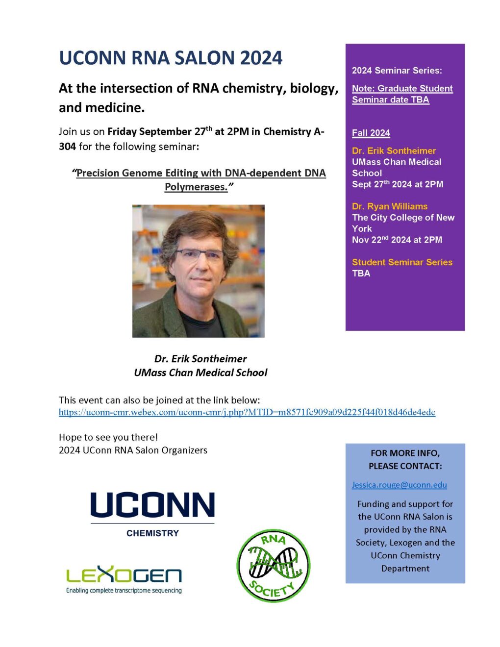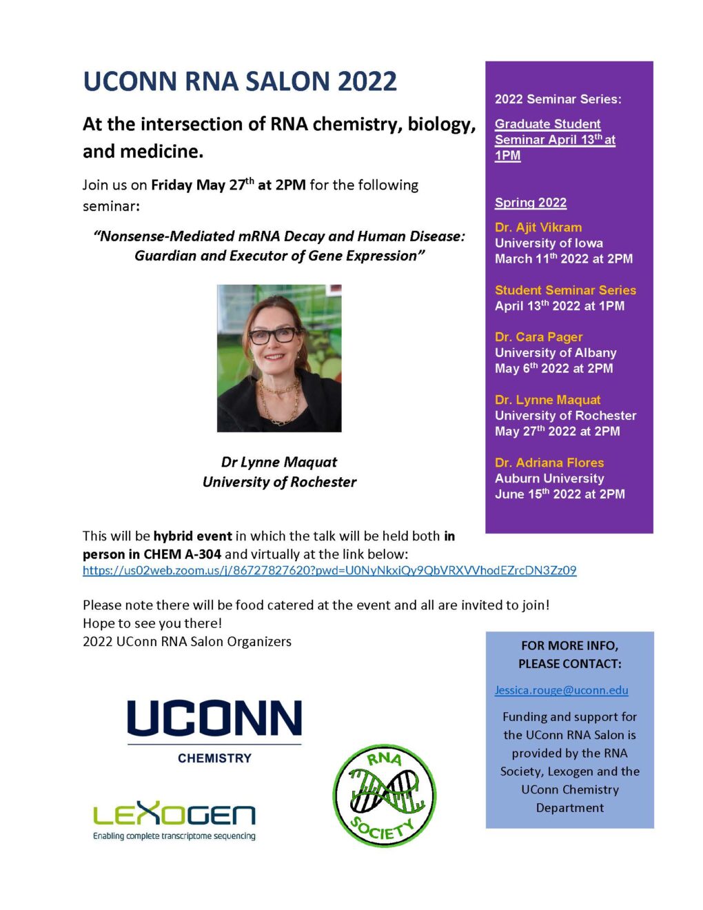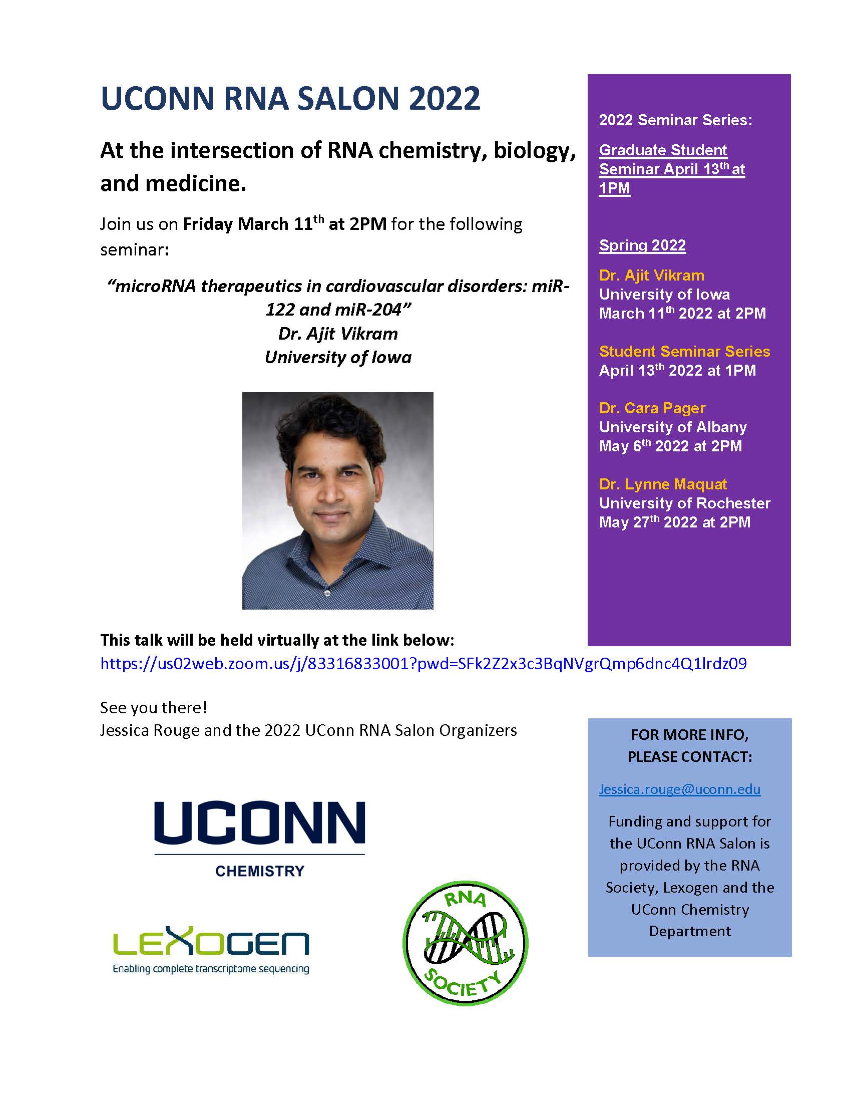 UConn RNA Salon – established in 2017 through funding by the RNA Society and supplemental funding from Lexogen, the RNA Salon is co-organized by members of the Rouge Lab and student co-organizers in other labs focused on RNA research on UConn campus. The UConn RNA Salon is intended for research scientists at all levels, ranging from undergraduate to graduate students, postdocs and faculty, with interdisciplinary backgrounds, bringing attendees from chemistry, molecular cell biology, chemical engineering, biomedical engineering, pharmaceutical sciences, and medical sciences to provide a space to share results and spark collaborations.
