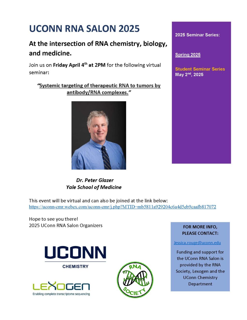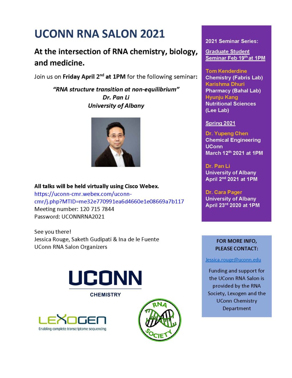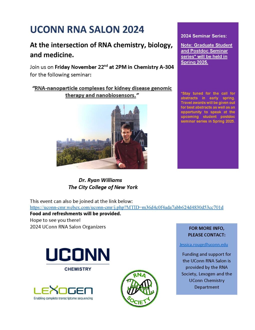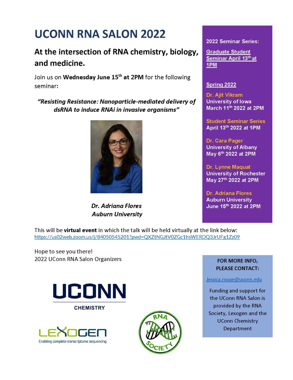 UConn RNA Salon – established in 2017 through funding by the RNA Society and supplemental funding from Lexogen, the RNA Salon is co-organized by members of the Rouge Lab and student co-organizers in other labs focused on RNA research on UConn campus. The UConn RNA Salon is intended for research scientists at all levels, ranging from undergraduate to graduate students, postdocs and faculty, with interdisciplinary backgrounds, bringing attendees from chemistry, molecular cell biology, chemical engineering, biomedical engineering, pharmaceutical sciences, and medical sciences to provide a space to share results and spark collaborations.